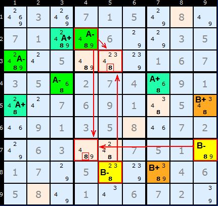 X的部分[[共轭对]]分别标记为颜色Color[A,B][+,-]ColorA+和ColorA-中,有且仅有 1 种成立`ColorB+和ColorB-中,有且仅有 1 种成立`存在区域